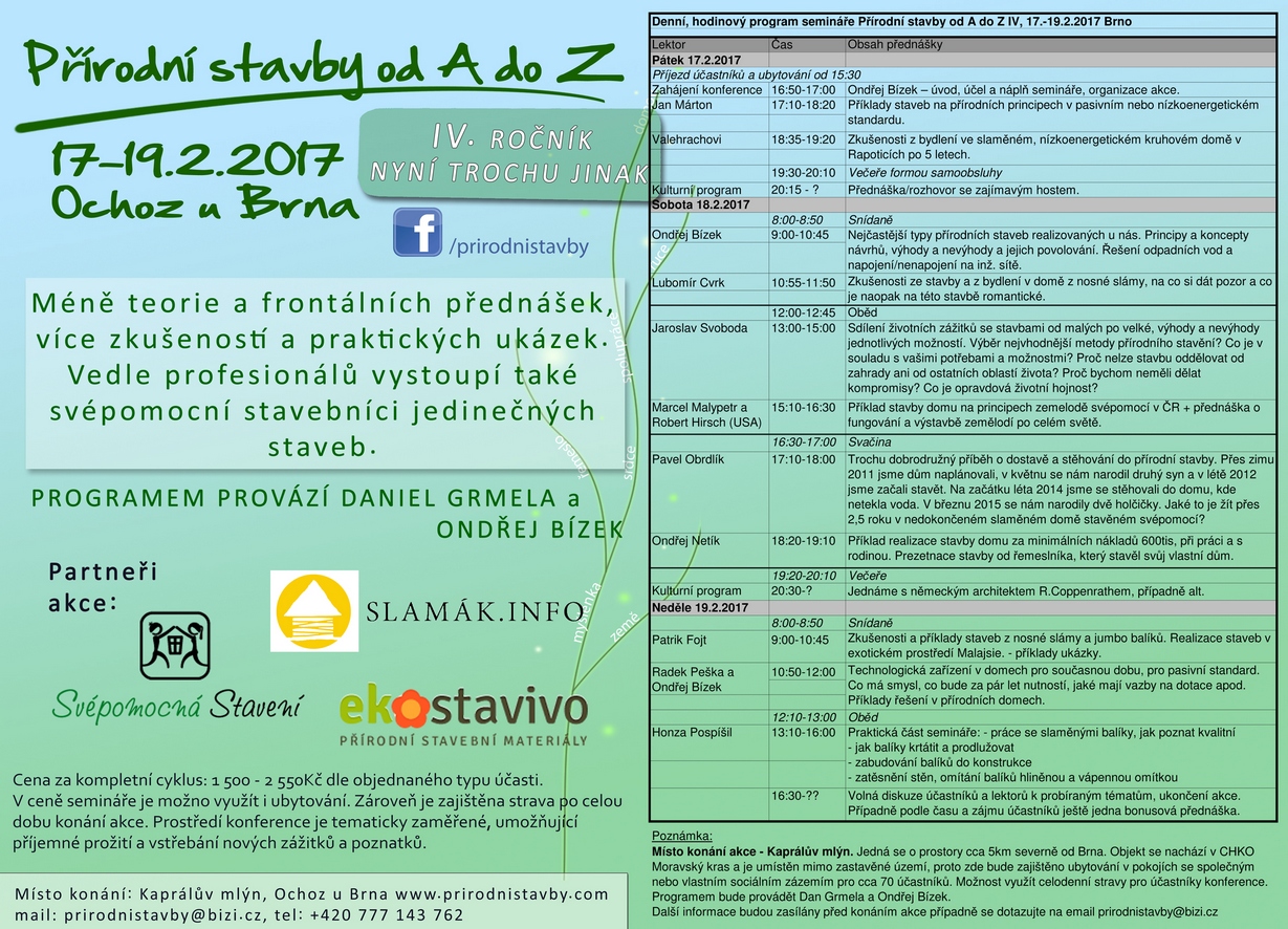 Aktualizovali jsme pozvánklu na IV. ročník konferencee. Došlo i k drobné změně v programu. Lukáš Čejna byl z rodinných důvodů nahrazen Patrikem Fojtem, který bude mít přednášku o stavbách z JUMBO balíků a o realizaci stavby superadobe v Malajsii. Jste srdečně zváni...